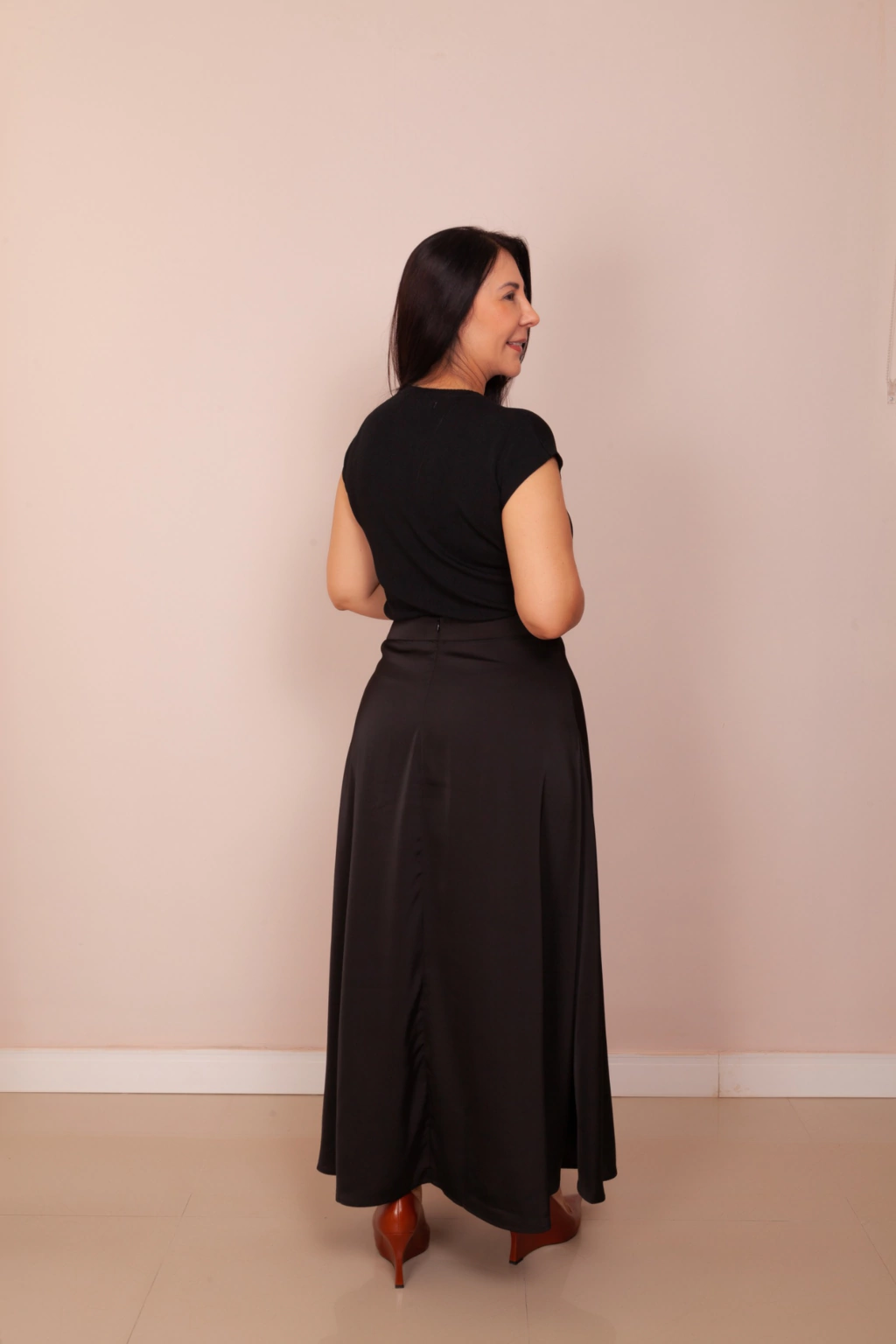 Sinta a elegância a cada passo com a Saia Longa em Cetim Preta!